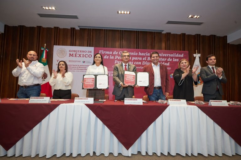 El gobernador Américo Villarreal Anaya firmó con la secretaria de Bienestar federal Ariadna Montiel Reyes, el convenio que permite incorporar a más de 28 mil tamaulipecas y tamaulipecos al programa «Pensión para el Bienestar de las Personas con Discapacidad», dando cumplimiento al compromiso adquirido con este grupo vulnerable de la población.