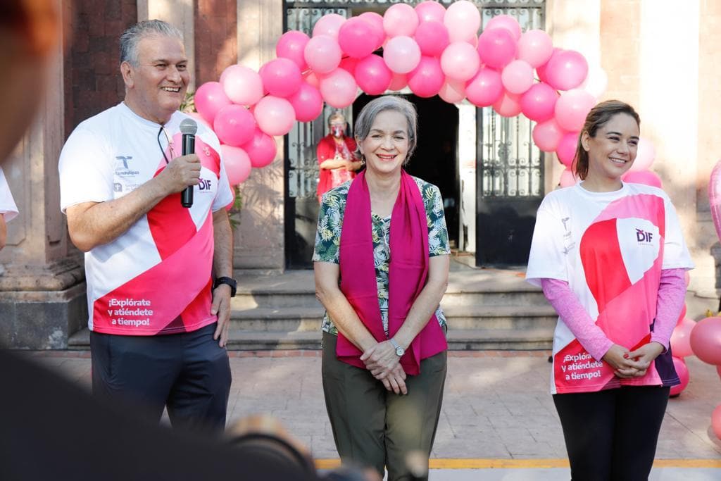 El recorrido inició frente a las instalaciones de la Secretaría de Salud, en donde la doctora María Santiago de Villarreal, Presidenta del DIF Tamaulipas, invitó a los presentes a sumarse a la campaña contra el cáncer de mama, al mismo tiempo que destacó la importancia del ejercicio físico para mejorar la salud y prevenir enfermedades y de esta manera lograr una mejor esperanza de vida llena de amor, paz y armonía en los hogares tamaulipecos.
