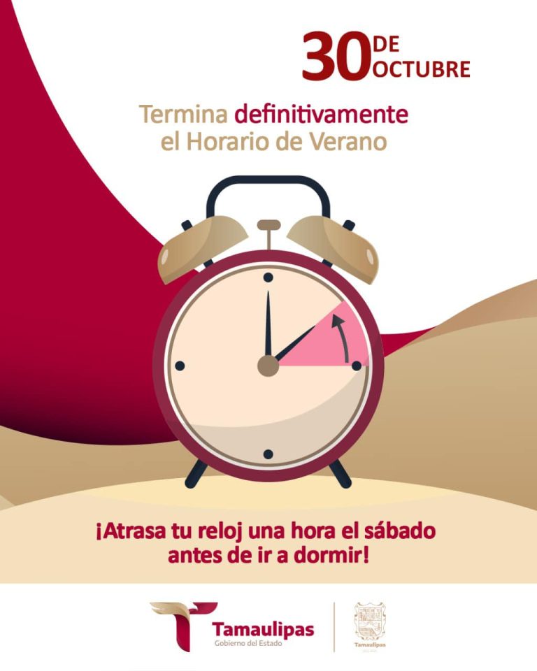 Este domingo 30 de octubre finaliza definitivamente el horario de verano, por lo que se deberá atrasar el reloj una hora el sábado 29 por la noche antes de ir a dormir. No aplica para los municipios de la zona fronteriza ( Nuevo Laredo, Guerrero, Mier, Miguel Alemán, Camargo, Gustavo Díaz Ordaz, Reynosa, Río Bravo, Valle Hermoso, Matamoros ).