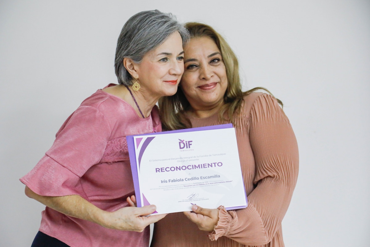 Unidas como mujeres y reunidas en el auditorio del Sistema DIF Tamaulipas, la doctora María de Villarreal, presidenta del organismo, compartió experiencias y sentimientos con quienes además de Fabiola, han salido adelante ante esa enfermedad.