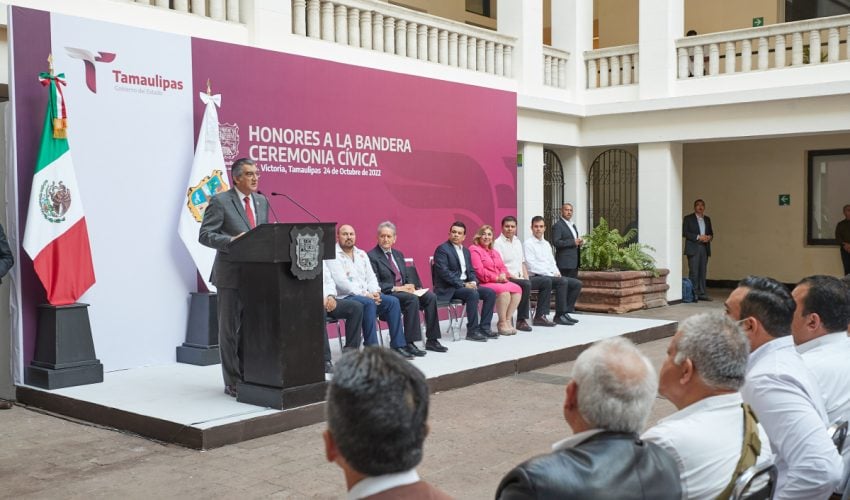 Tras rendir los honores a la bandera y después al escudo de Tamaulipas, se procedió a las palabras de bienvenida a la ceremonia, que estuvieron a cargo del Jefe de la Oficina del gobernador, Gerardo Ricardo Guerrero Morales, quien enfatizó que el palacio de gobierno, los recibió para recordarles su compromiso, con la transformación de Tamaulipas.