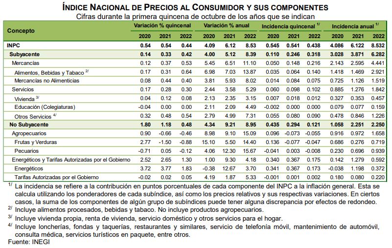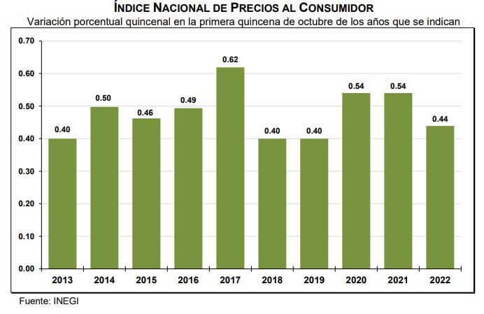 En la primera quincena de octubre de 2022, el Índice Nacional de Precios al Consumidor (INPC) aumentó 0.44 % respecto a la quincena anterior. Con este resultado, la inflación general anual se ubicó en 8.53 por ciento. En la misma quincena de 2021, la inflación quincenal fue de 0.54 % y la anual, de 6.12 por ciento.