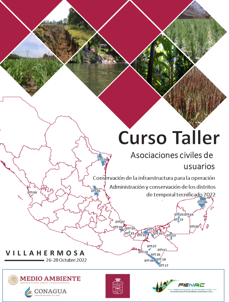 En le marco de las acciones de apoyo de Asesoría Técnica Especializada de la componente de Rehabilitación, Tecnificación y Equipamiento de Distritos de Temporal Tecnificado 2022, la FENAC (Federación Nacional de Asociaciones Civiles de Usuarios de Distritos de Temporal Tecnificado S. de R.L.), la CONAGUA (Comisión Nacional del Agua), SEMARNAT (Secretaría de Medio Ambiente y Recurso Naturales) y el Gobierno del Estado de Tabasco como estado anfitrión, realizan la reunión nacional anual denominada «Curso Taller en las Asociaciones Civiles de Usuarios en la Conservación de la Infraestructura para la Operación y Administración de los Distritos de Temporal 2022».