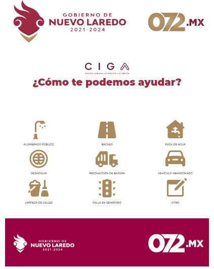 El Gobierno municipal de Nuevo Laredo, que dirige la presidenta municipal Carmen Lilia Canturosas, invita a los ciudadanos a realizar reportes de atención de servicios públicos municipales, de alumbrado público, bacheo, recolección de basura y fugas de agua, llamando al número 072 y por medio del portal http://072.mx/, del Centro Integral de Gestión y Atención del municipio, donde se solicitan los datos generales de la persona que hace el reporte, servicio público reportado, ubicación del reporte y comentarios generales de la solicitud de atención.