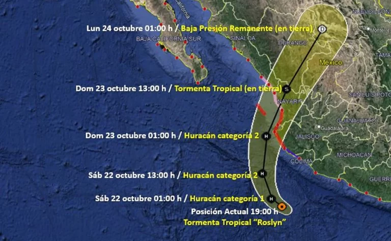De acuerdo con su pronóstico de trayectoria, se indica que el huracán Roslyn tocaría tierra sobre la costa centro-norte de Nayarit, posiblemente en el municipio de Santiago Ixcuintla en el transcurso de la mañana del domingo.