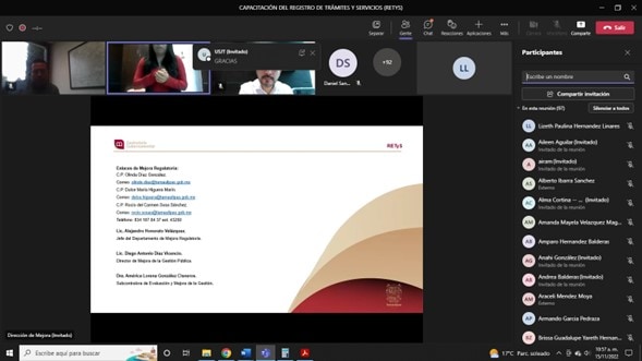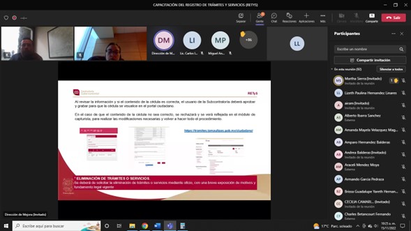 La reunión se efectuó de manera virtual, con la participación de 95 servidores públicos, entre enlaces jurídicos, capturistas y titulares de Mejora Regulatoria, a quienes se les brindó la capacitación adecuada para el uso de la Plataforma del Registro Estatal de Trámites y Servicios (RETyS) y con ello, fortalecer el servicio y atención que se brinda a la ciudadanía.