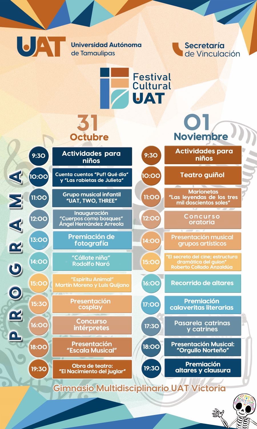 El Festival Cultural de la UAT se lleva a cabo los días 31 de octubre y 1 de noviembre; en su primer día de actividades se llevaron a cabo eventos interactivos para niños y participaron grupos artísticos de teatro y música, así como de fotografía de la UAT.