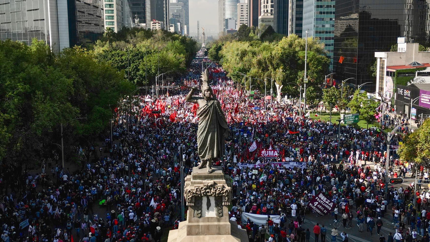 Tras encabezar la marcha, que inició a las 9:00 horas en el Ángel de la Independencia, afirmó que la nueva política económica, moral y social consiste en fomentar el progreso con justicia, es decir, la distribución equitativa del ingreso y la riqueza.