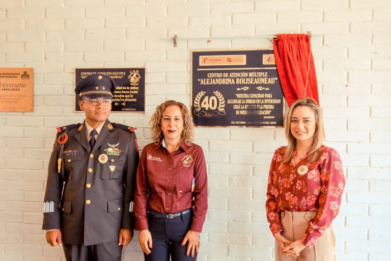 La presidenta del Sistema DIF Victoria, Lucy Rodríguez de Gattás asistió al Centro de Atención Múltiple (CAM) “Alejandrina Boijseauneau” para celebrar su 40 Aniversario con la presencia de quién en compañía de niñas y niños develó la placa conmemorativa colocada en el acceso principal del instituto.