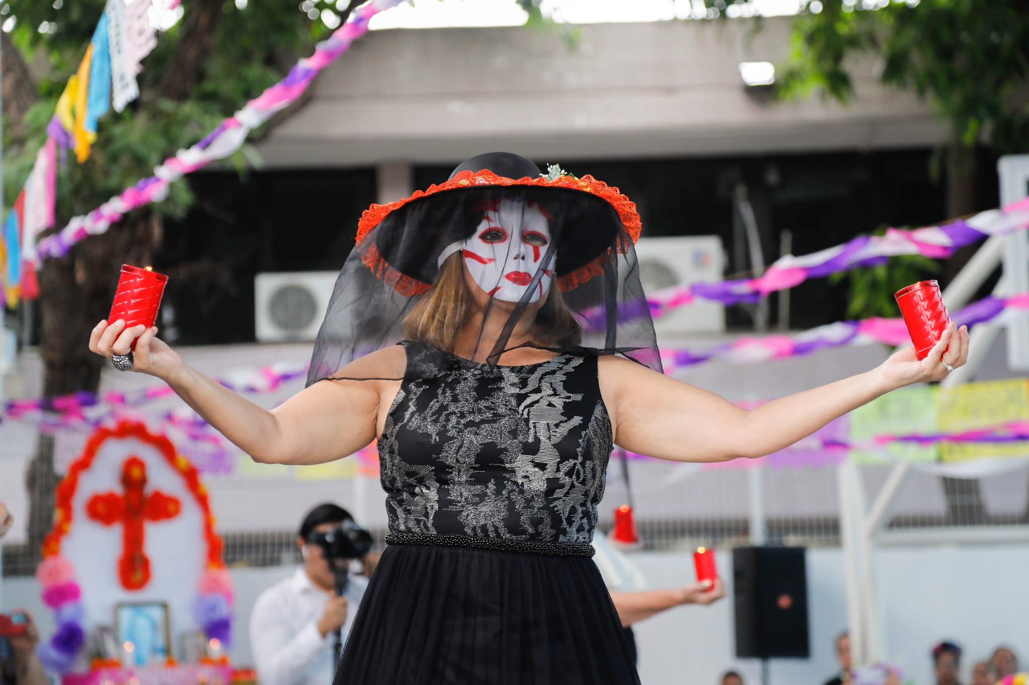 Después de ese mensaje, junto a los asistentes, visitó el altar de muertos, ese que representa nuestras tradiciones mexicanas más ancestrales y que se relaciona con el mestizaje, comprendiendo nuestros rasgos culturales indígenas y españoles que se mezclan, dando lugar a todos los ritos y ceremonias que se realizan alrededor de la festividad.