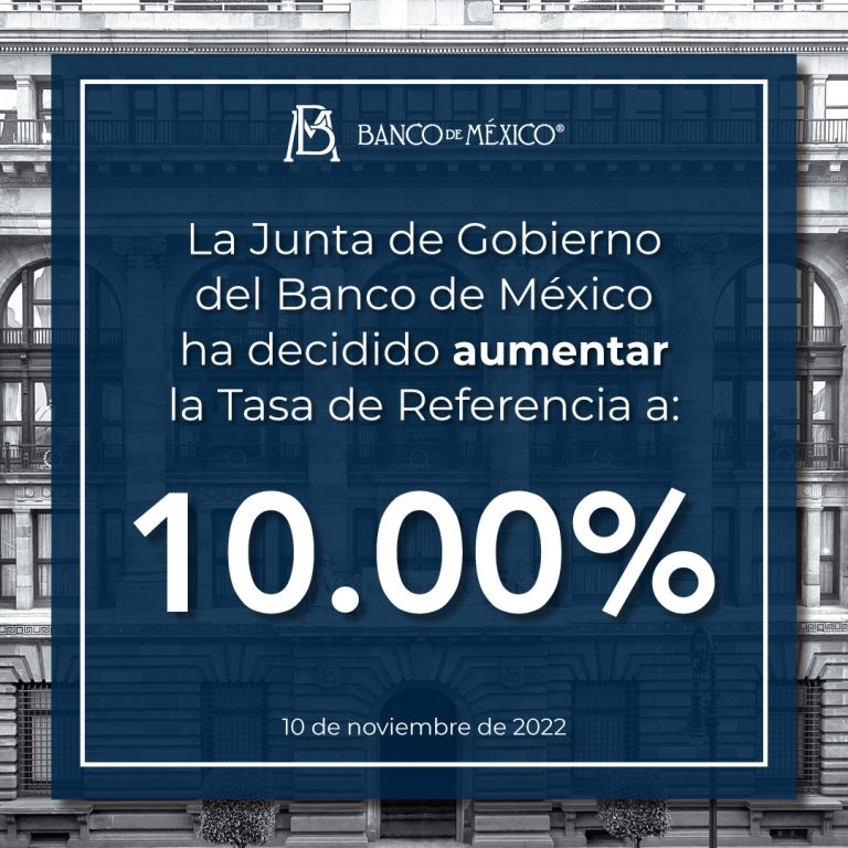 Informó el Banco de México que la Junta de Gobierno del Banco decidió incrementar en 75 puntos base el objetivo para la tasa de interés Interbancaria a un día a un nivel de 10.00%, con efectos a partir del 11 de noviembre de 2022.