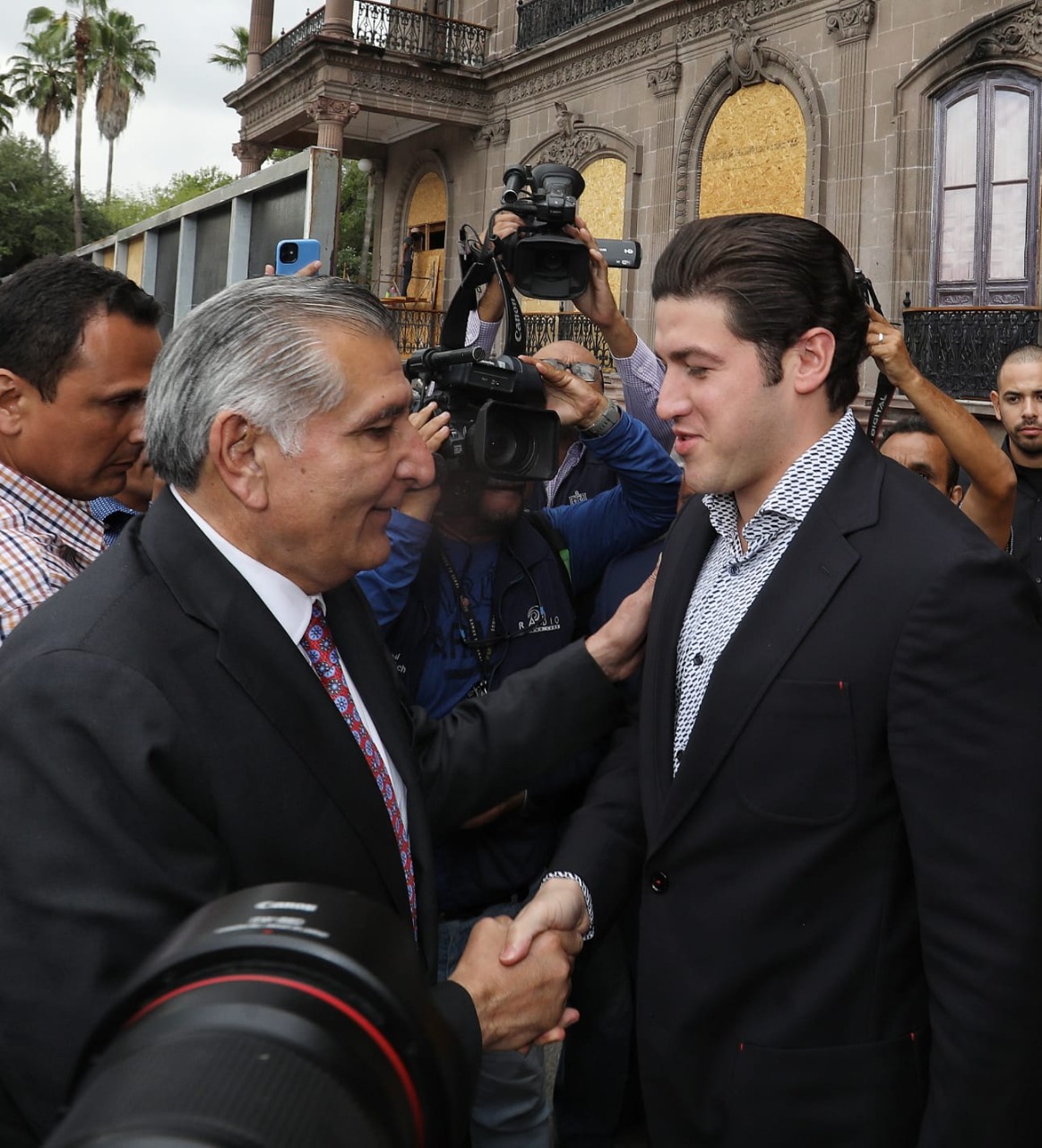 A las puertas del Palacio de Cantera, el mandatario estatal Samuel García recibió a su invitado con un “Bienvenido al mejor Estado del país”.