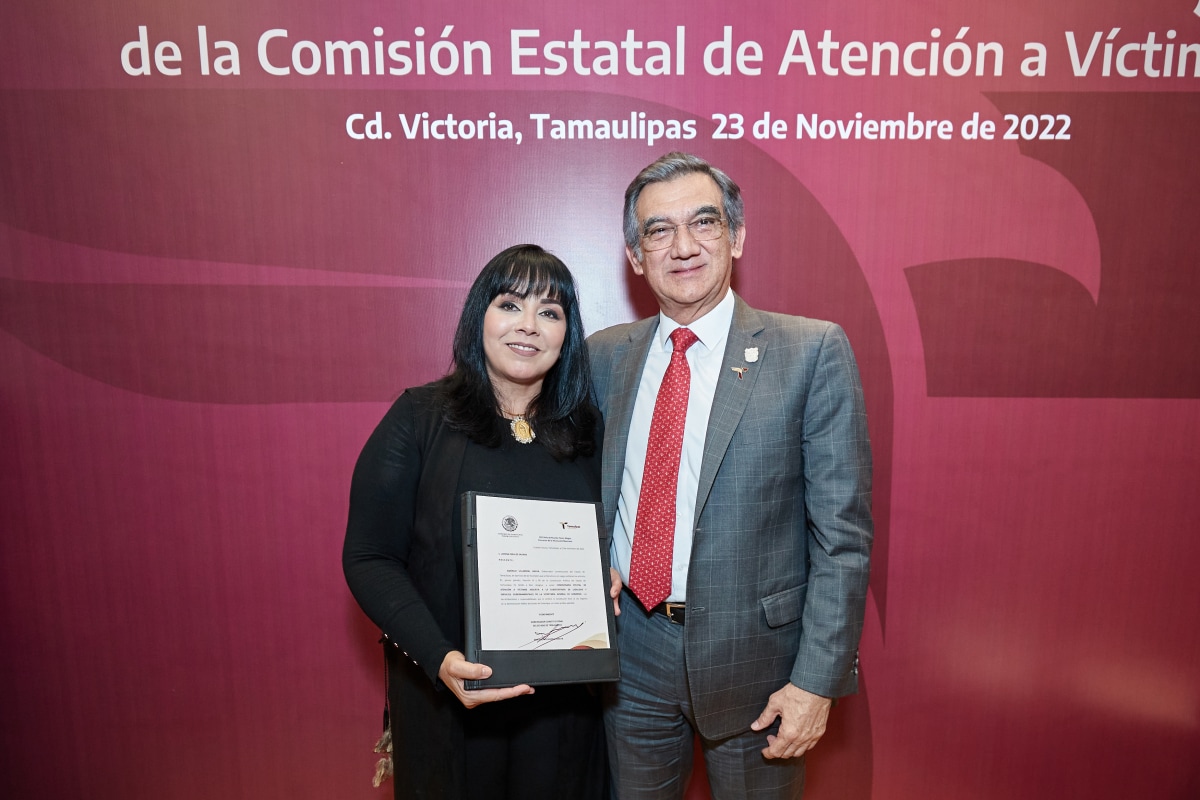 Gobernador Américo Villarreal entrega nombramiento a titular de la Comisión Estatal de Atención a Víctimas, Lorena Perales.
