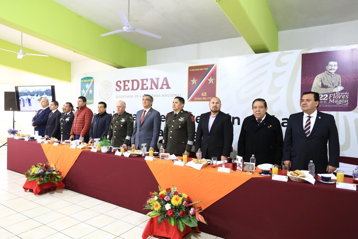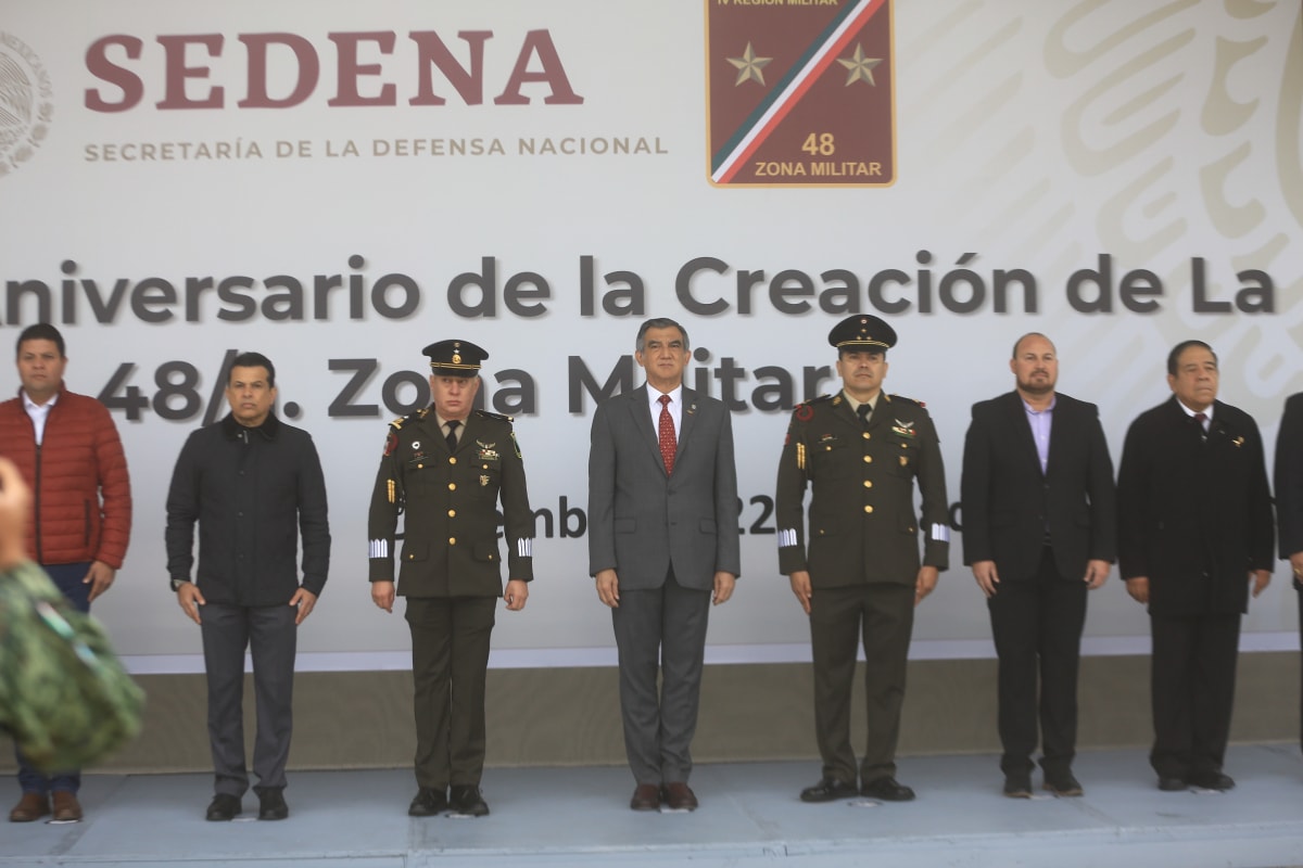 Ante la presencia del general brigadier DEM Fernando Lima Cuauhxochilt, jefe de estado mayor de la 48/a Zona Militar, quien presidió la ceremonia del primer aniversario, la cual pasó revista de entrada el primero de diciembre de 2021, también destacó la labor del Ejército en obras sociales y apoyo comunitario como las sedes del Banco del Bienestar, que son claves para la dispersión de recursos de los programas sociales del presidente.