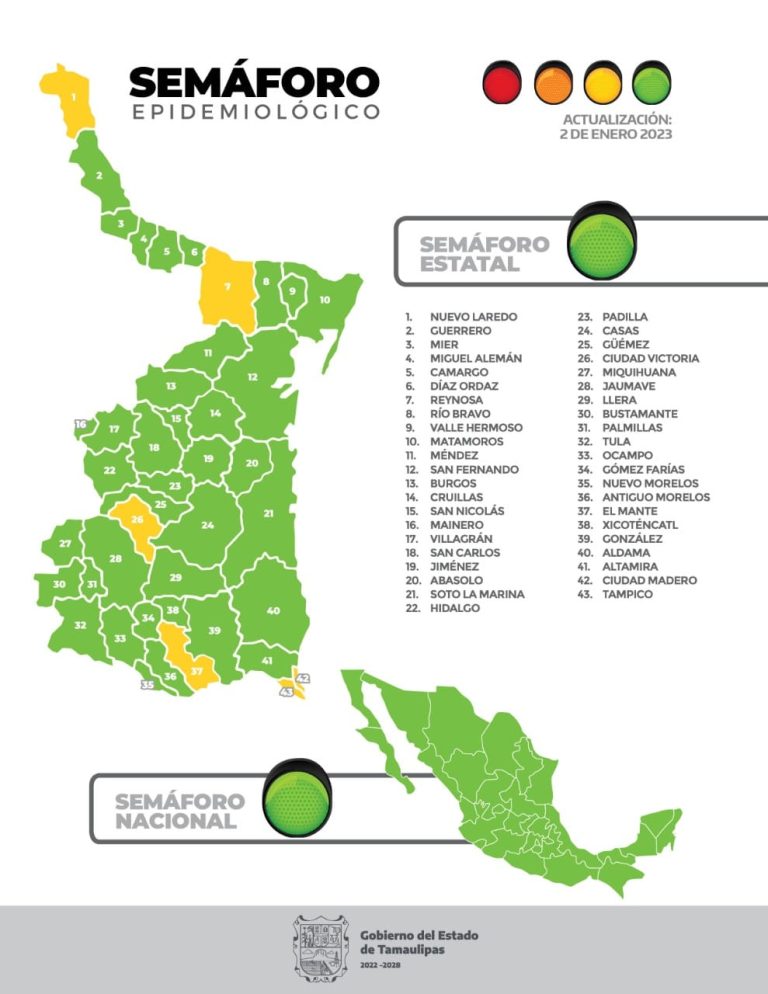 La Secretaría de Salud de Tamaulipas anunció este lunes 2 de enero que la jornada terminó con 7 nuevos casos de COVID-19, afortunadamente no se registraron defunciones, esto de acuerdo con la información proporcionada por el Secretario de Salud, Vicente Joel Hernández Navarro.