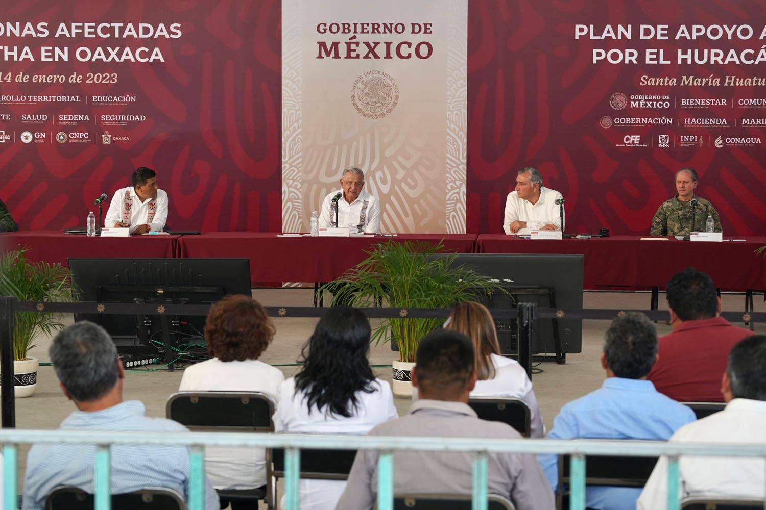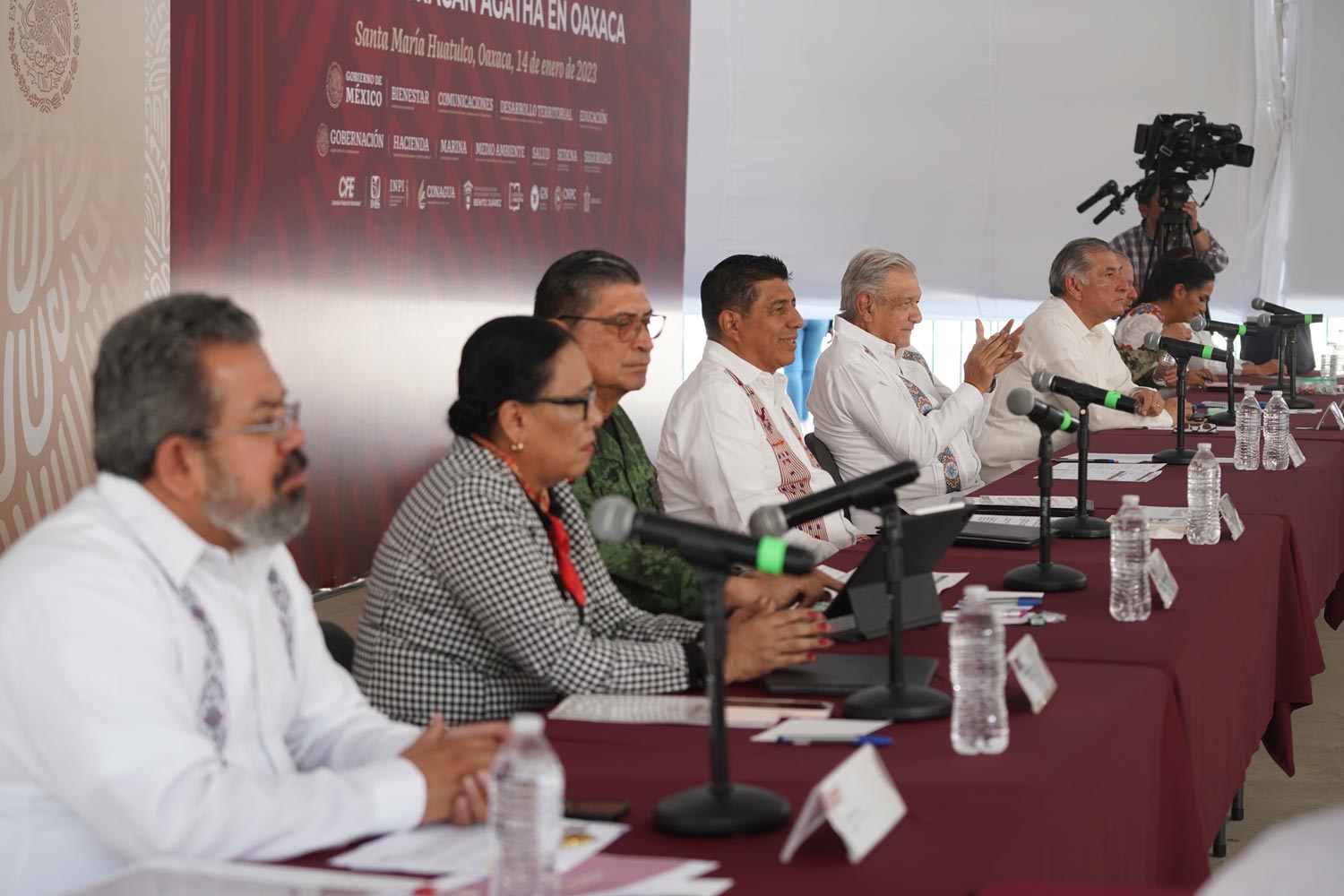 Además, el coordinador general de Programas para el Bienestar, Carlos Torres Rosas; la directora general del programa La Escuela es Nuestra, Pamela López Ruiz; los directores generales del Instituto Mexicano del Seguro Social, Zoé Robledo Aburto; de la Comisión Nacional del Agua, Germán Arturo Martínez Santoyo; del Instituto Nacional de los Pueblos Indígenas, Adelfo Regino Montes; el coordinador nacional del programa de Becas para el Bienestar Benito Juárez, Abraham Vázquez Piceno; el comandante de la Guardia Nacional, Luis Rodríguez Bucio; el gerente de la División de Distribución Sureste de la Comisión Federal de Electricidad, José Carlos Paredes Aquino, además de presidentas y presidentes municipales de los 31 ayuntamientos afectados por el huracán Agatha.