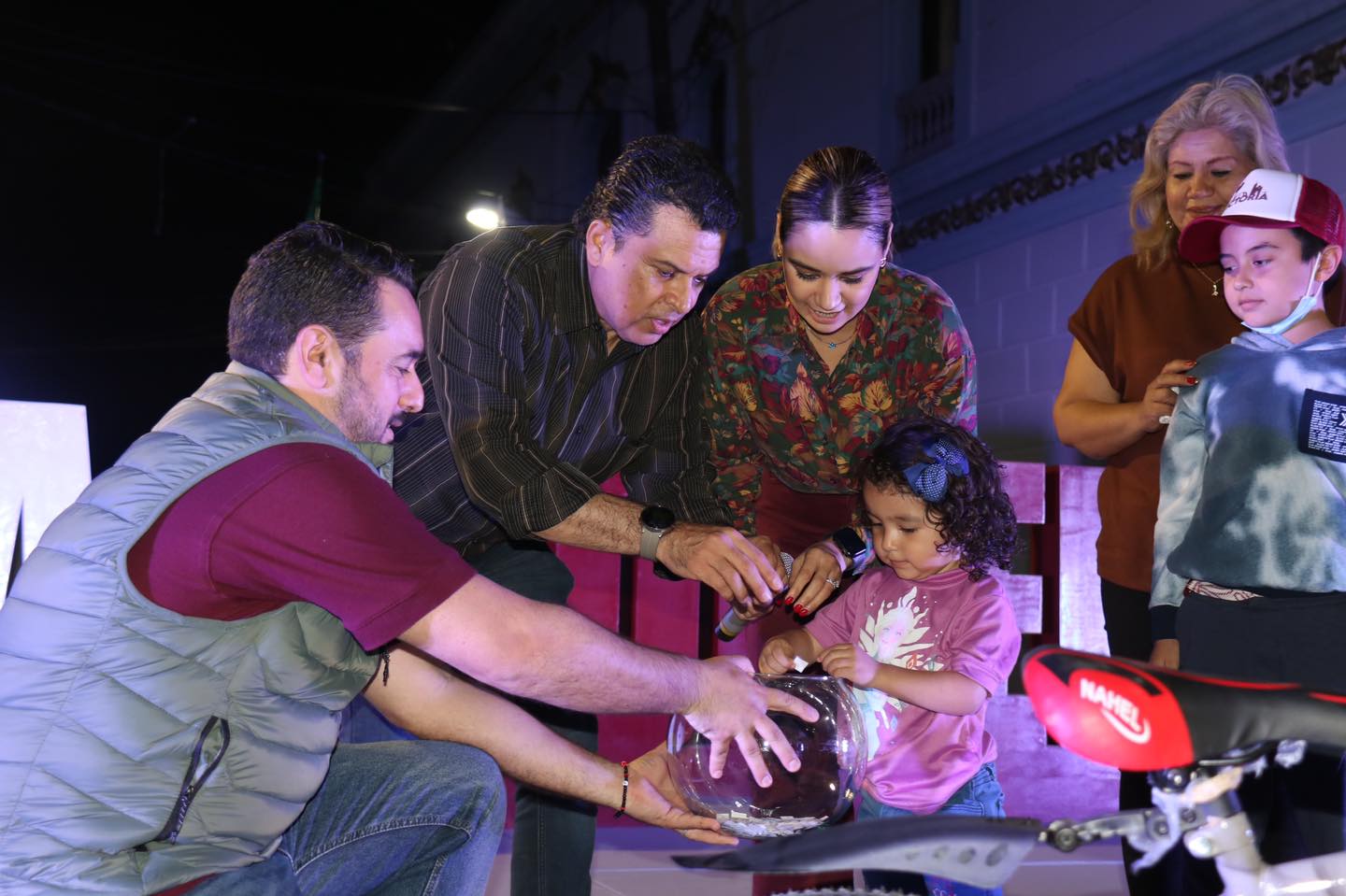 El alcalde y su esposa, dirigieron la rifa de 4 bicicletas que se entregaron posteriormente a los afortunados niños que resultaron ganadores.