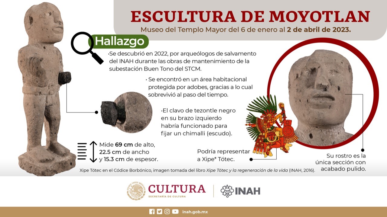 El Instituto Nacional de Antropología e Historia (INAH), invitó por medio de sus redes sociales a conocer la escultura mexica de Moyotlan, que recuperada en 2022, ahora estará disponible para el público en el Museo del Templo Mayor, en donde permanecerá hasta el próximo mes de abril.