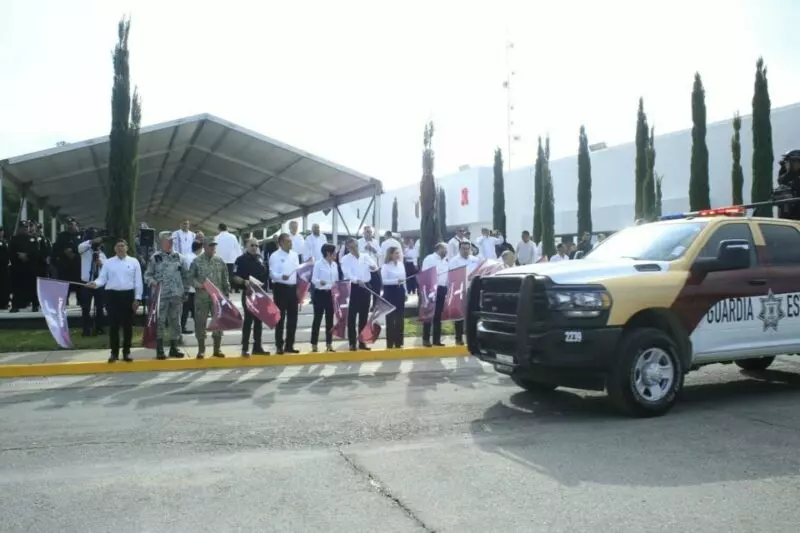 Durante el evento, en el Complejo Estatal de Seguridad Pública, el gobernador dio el banderazo a 14 vehículos blindados tipo Mamba y 15 camionetas pick up Ram 2500, para fortalecer el despliegue operativo de la corporación.