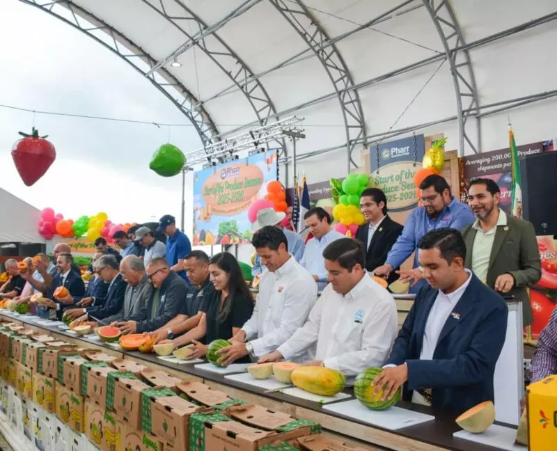 Durante el evento, Eliseo Camacho Nieto, subsecretario de Desarrollo Agrícola, asistió en representación del titular de la dependencia estatal, Antonio Varela Flores, destacó la trascendental relevancia del cruce de alimentos perecederos en este punto fronterizo, donde diariamente más de 6,000 camiones transportan productos frescos, demostrando así que el Puente Internacional de Pharr es una arteria vital para el comercio agroalimentario binacional.
