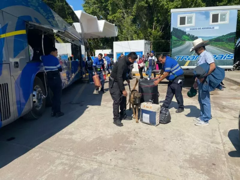 Durante la intervención, el canino “Looky” realiza barridos preventivos en pasillos, sala de espera, andenes, áreas comunes y la zona de paquetería, además de la inspección de maletas y autobuses de distintas líneas de transporte foráneo.