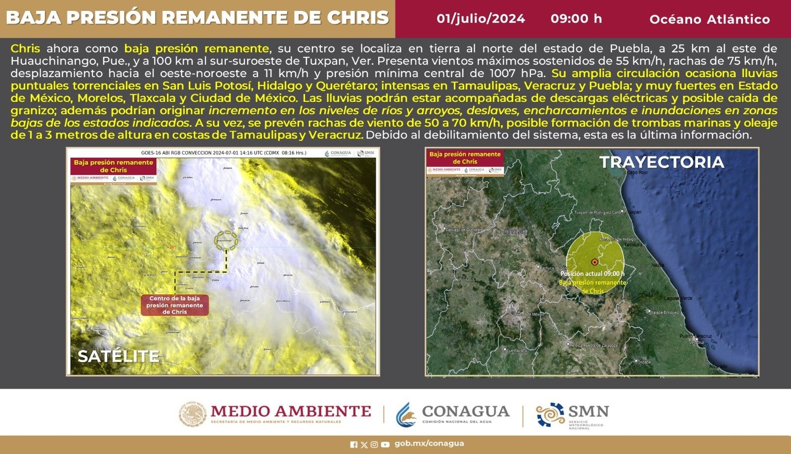 Tras tocar tierra la noche de este domingo como tormenta tropical en la localidad de Lechuguillas, Veracruz, “Chris” se degradó…